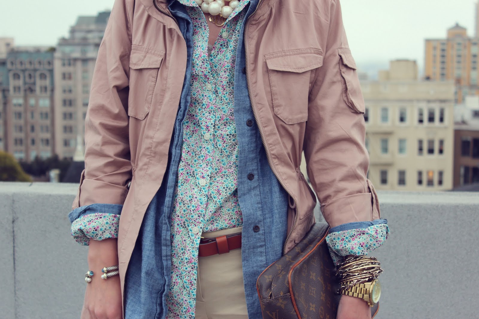 Ditsy Print Woven: Old Navy. Chambray Woven: GAP. Jacket: H&M. Shorts: Theory. Shoes: Pour La Victoire. Belt/Headband: Jcrew. Purse: Vintage LV. Jewelry: David Yurman, Michael Kors, GAP, Pomellato, BR, Chan Luu. Sunglasses: Old Navy. Lipstick: Make Up Forever Professionals #41.