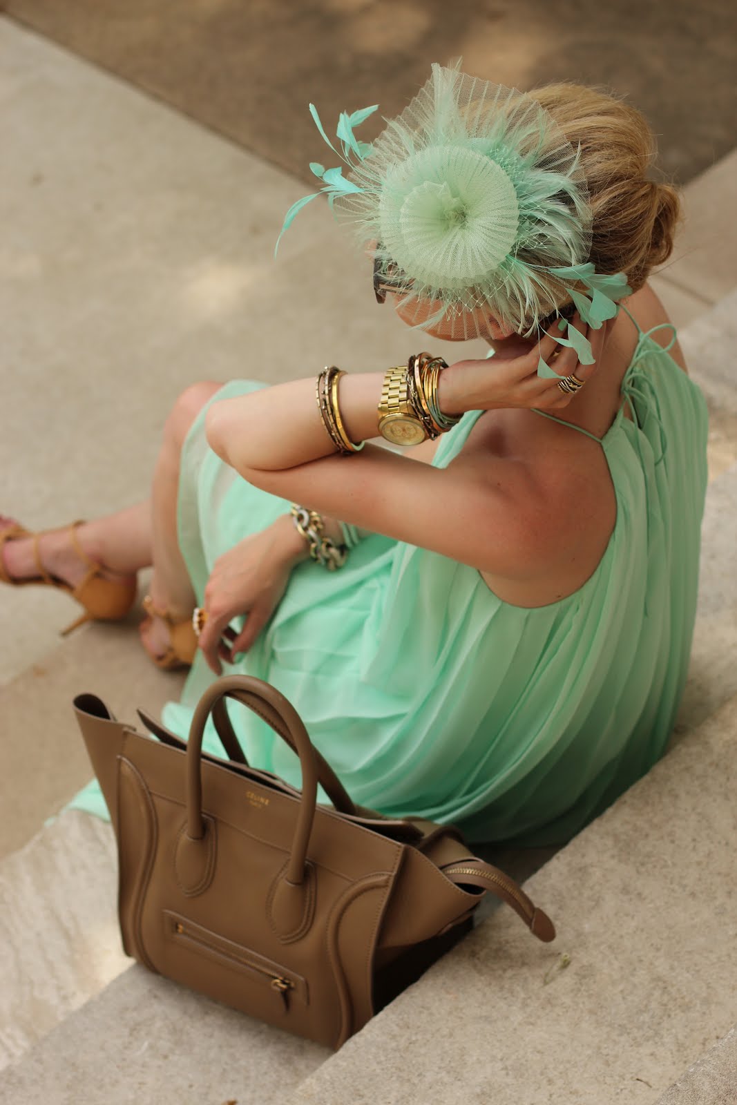 Dress: Tibi (also here). Shoes: Zara (Current). Sunglasses: Karen Walker 'Number One'. Purse: Celine. Jewelry: David Yurman, Michael Kors Watch, GAP, BR, Pomellato, YSL. Nails: Maybelline 'Green With Envy'. Fascinator: HeadCandi.